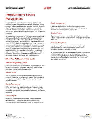 Service Management connects the operational work of dispatching technicians and recording repairs with the financial discipline of project accounting and invoicing. It provides the controls and parameters that govern service operations, the service orders that track individual engagements, the agreements that define recurring relationships, the object records that identify the equipment being serviced, the repair management tools that diagnose and resolve faults, the dispatch teams that coordinate field workers, and the subscription billing that automates recurring fees. Greta Ironfist expects every service call to be tracked, every part consumed to be posted, and every invoice to reflect the true cost of the work performed. These labs deliver that level of accountability.